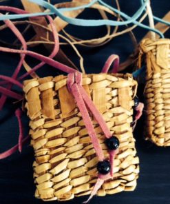 Hand-pulled red and yellow cedar bark is stripped into twine and hand-woven into a pouch of approximately 2″ by 2″ used for medicine. Color trims of your choice is available.