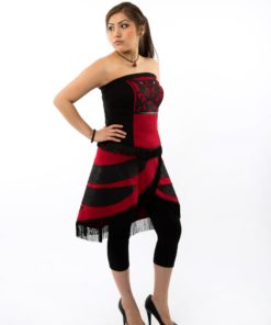 Capri length leggings are attached to beautiful blanket wrap skirt edged with fringe. Appliques are hand-cut and sewn on to the garment to coordinate with the crest of melton bustier.