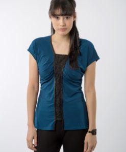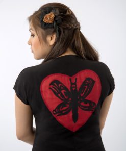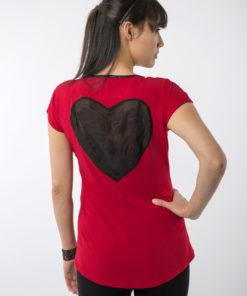 Cap sleeve top with sheer heart inset back and lace front inset. Crest: specify 2 combos or butterfly.