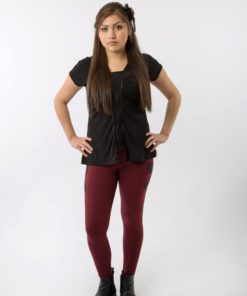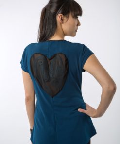 Cap sleeve top with heart-shaped back sheer inset. Front has narrow lace panel to create a slim long look. Back is cut longer to coordinate the leggings.