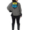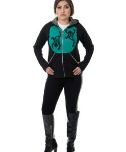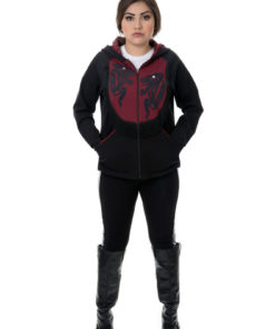 Long sleeve hoodie with contrast panels and crest designs of your choice in pleather. Chilkat knit lines hood and trims pocket edges.