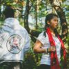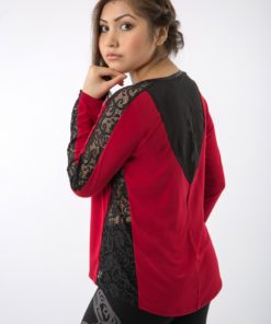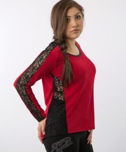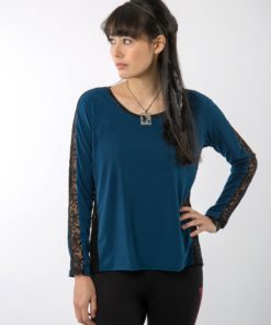 Long sleeve crew neck top with side and shoulder panels in lace and back sheer inset. The back length is cut longer to complement the leggings.